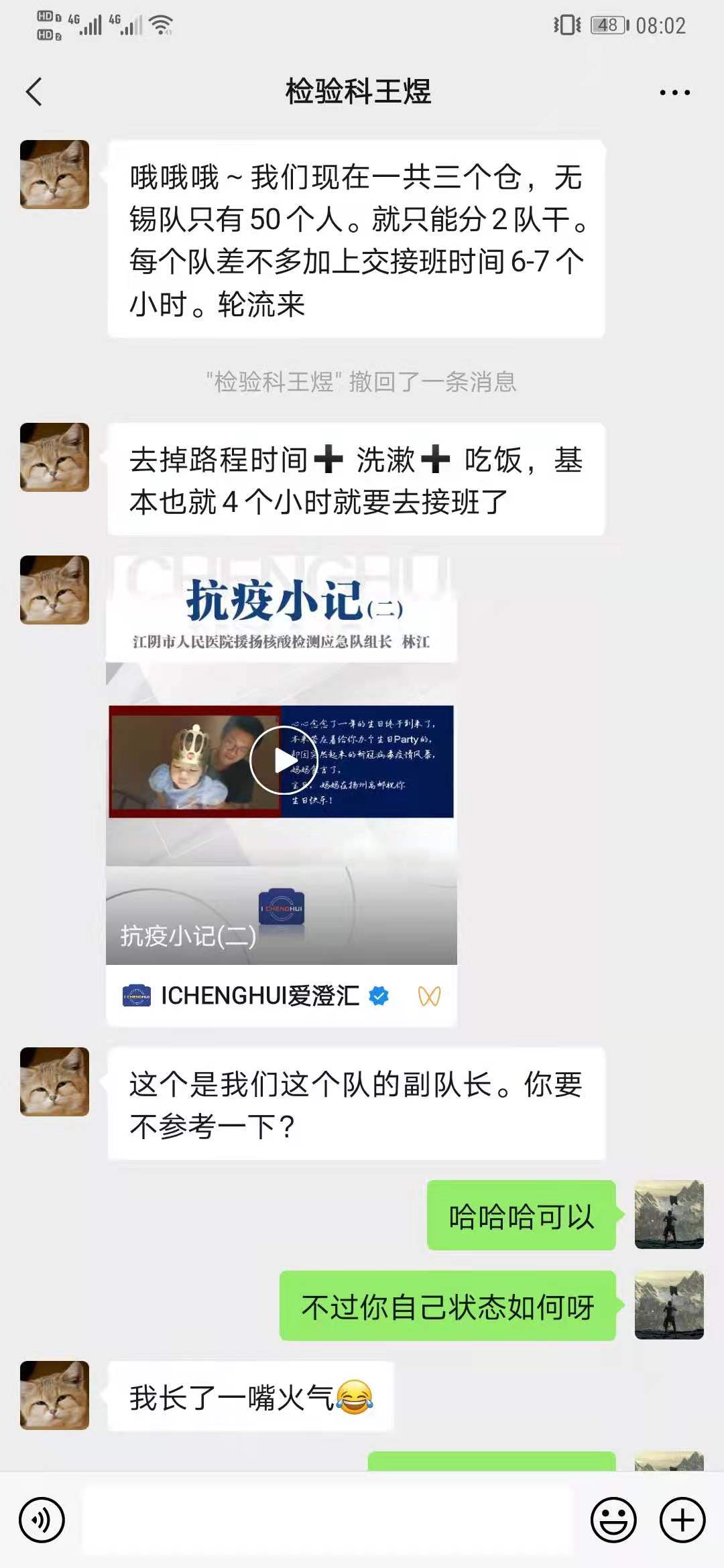 目前,作为无锡核酸检测医疗援助队的成员,我院检验科王煜和秦瑛两位队员仍在紧张的援扬工作中。他们7月27日落地南京,8月3日又随队辗转至扬州,在外已三周有余。