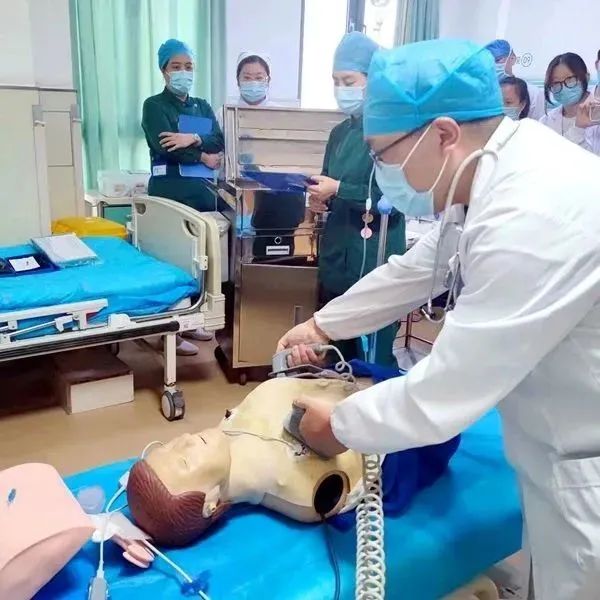 演练以非诊疗区一名患者突然晕倒发生心跳骤停展开。工作人员听到家属呼救后,立即奔向现场,迅速判断为心跳骤停并立即启动心肺复苏,同时呼叫其余医务人员加入急救。患者安全转运至抢救区进行抢救,过程中不间断胸外按压与呼吸球囊辅助通气,为患者争取宝贵的时间。规范的按压动作、深度和频率,及时有效的电除颤,快稳准的气管插管,有创呼吸机的使用,快速有效的静脉通道,口头医嘱的核对确认,以及后续抢救记录的完善,报告相关部门,与家属的沟通谈话等一系列程序都进行了演练呈现。